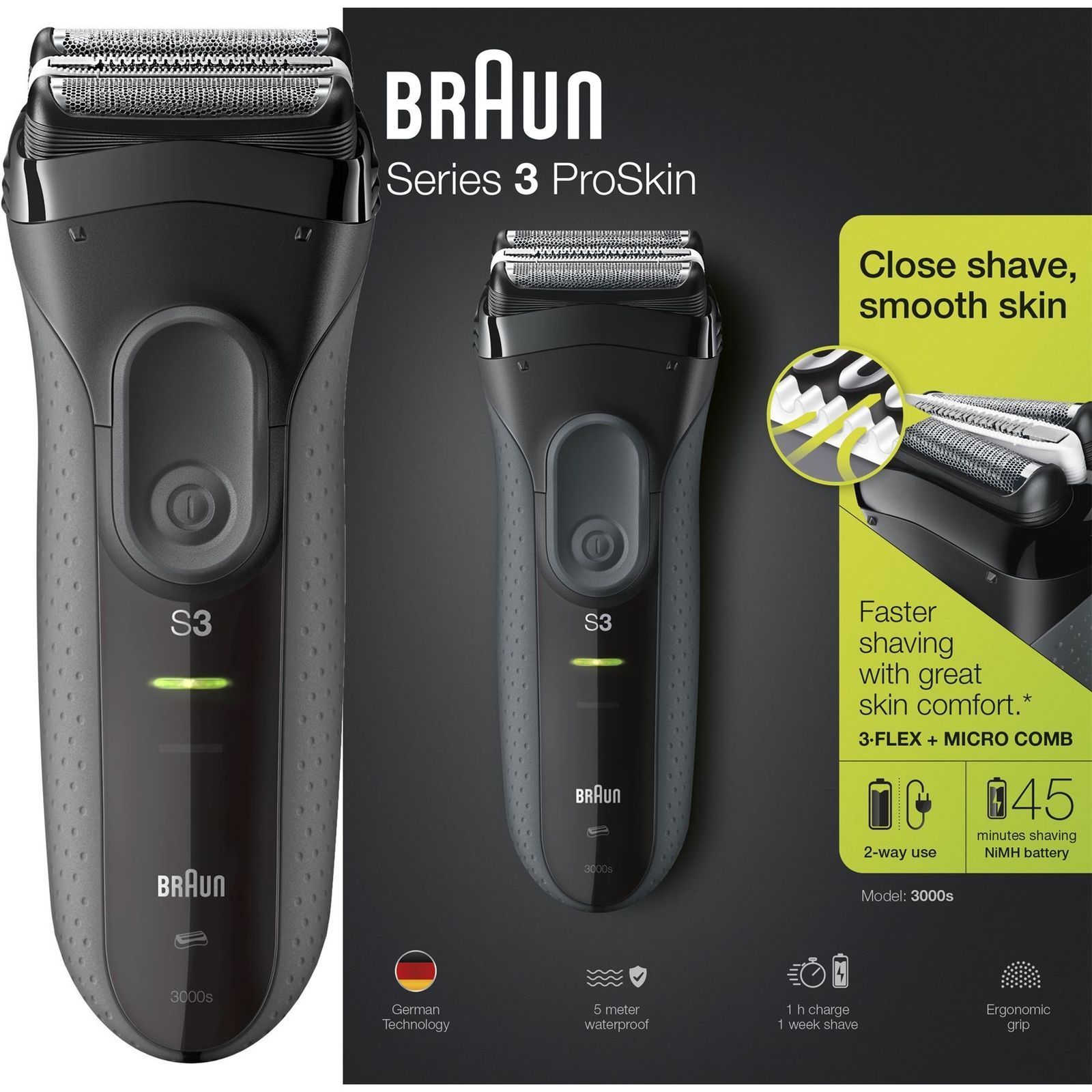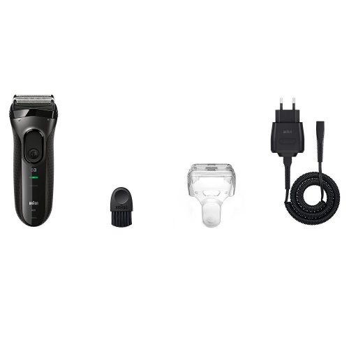 Braun Series 3 ProSkin 3000s Electric Shaver/Rechargeable Electric Razor – BlackMicro comb guides more hair into the cutting parts of the electric shaver for faster shavingThree independently floating cutting elements adapt to facial contours100% waterproof shavers for easy cleaning